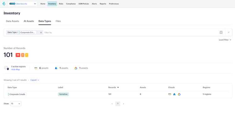 Clicking on the name Corporate Emails from the Data Type column opens a separate page for this data type, detailing the active regions it was detected in, and listing assets with records of this email data type.