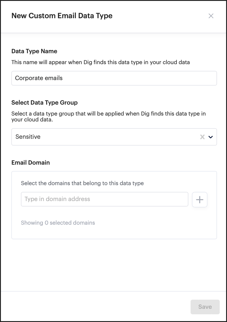 - Email Domain - enter one or more email domains that you want to associate with this data type. After typing each domain, click + to add it.